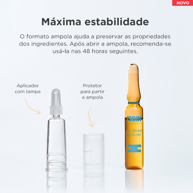 Solução facial em ampolas com uma avançada combinação de duas moléculas de ácido hialurónico, de médio e baixo peso molecular, que ajudam a pele a recuperar os seus níveis de hidratação para conseguir uma pele radiante.